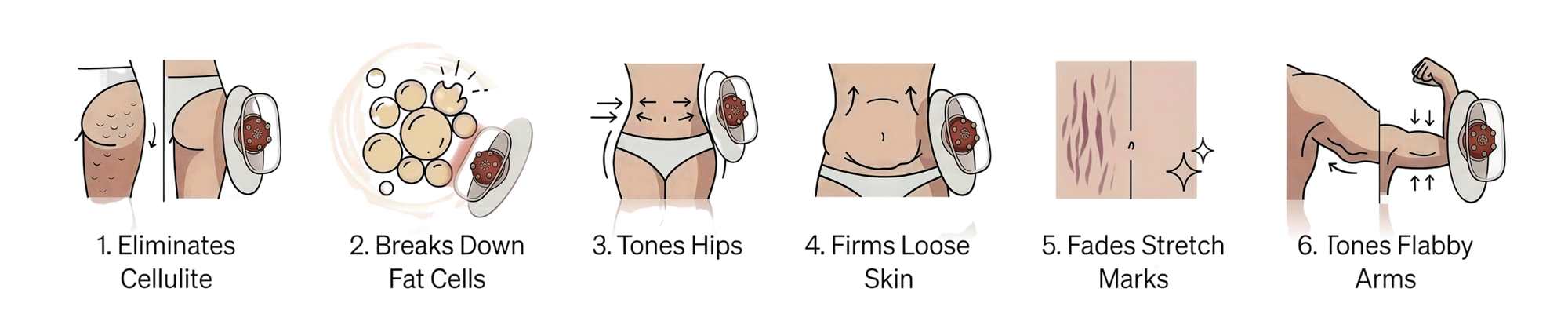 Unlike surface treatments that only mask the problem, Celluxa targets all three root causes of cellulite, loose/saggy skin & stretch marks simultaneously with professional-grade technology.